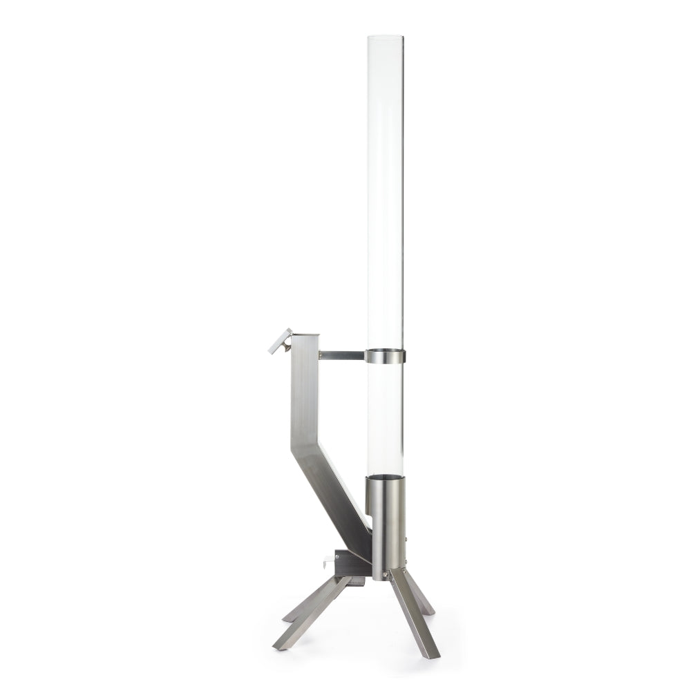 Das silberne Feuerrohr wiegt inklusive Glasrohr etwa 5,4 kg. Damit ist es stabil genug, um sicher zu stehen, und gleichzeitig noch handlich, sodass du es ohne großen Aufwand auf Terrasse oder im Garten aufstellen kannst.