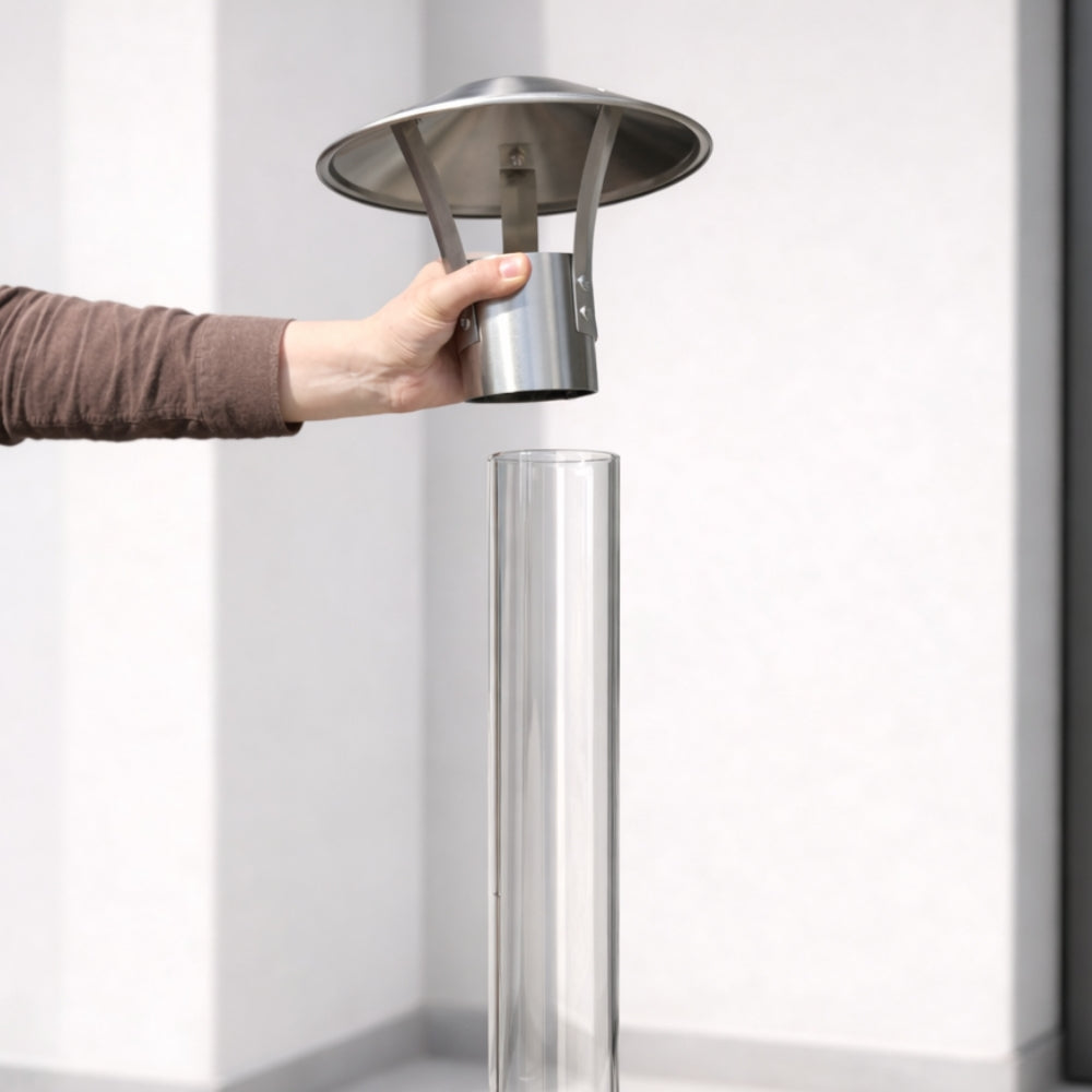 Wir empfehlen, den Funkenfänger direkt nach dem Aufsetzen des Glasrohrs aufzusetzen – also bevor das Klassik Feuerrohr heiß wird. So stellst du sicher, dass der Aufsatz korrekt sitzt und vermeidest das Risiko von Verbrennungen. Das Anbringen während des Betriebs ist nicht ratsam, da der Funkenfänger und das Glasrohr sehr heiß werden können.